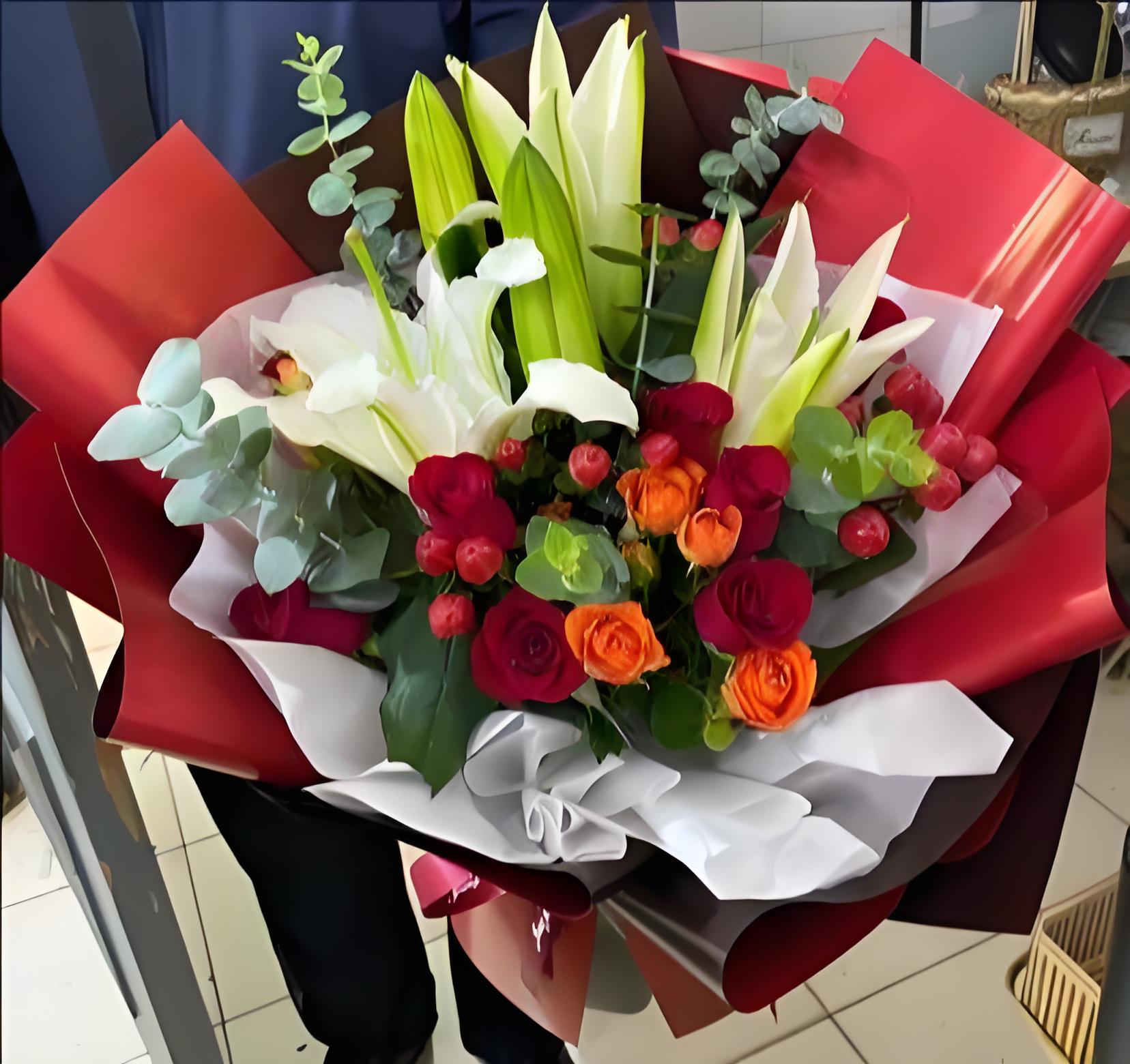 汕头濠江区花店包11枝红玫瑰、2枝多头白百合、6枝橙色多头玫瑰、红豆、尤加利叶